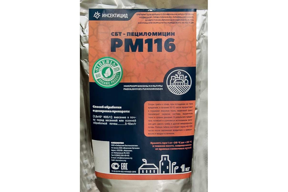 Новейший биотехнологический препарат для борьбы с почвенными вредителями: медведкой,проволочником, нематодами, личинками совок,личинками белокрылки, диабротикой, личинками майского жука, зимующими формами колорадского жука и др.Способ обработки: вносят в почву любым доступным способом:методом смешивания с удобрениями, в растворе с поливной водой,опрыскиванием почвы, путем смешивания с носителем (песок, земля,органические удобрения, компост). Применять препарат рекомендуется осенью или весной, особенно в период выпадения проливных дождей. После внесения препарата почва обрабатывается в соответствии с технологией:пахота, культивация, окучивание. Наиболее эффективно вносить препарат во влажную почву перед ее обработкой в почву - 10 гр на 10 кв.м или 100 гр на 100 кв.м. Для замачивания рассады, саженцев перед посадкой - 50 г / 10л воды, от 2-хчасов. Норма расхода препарата зависит от заселенности грунтовымивредителями и составляет 100-150гр на 1 сотку. Норма рабочего раствора 2-Результат применения: Ежегодное применение препарата СБТ -существенно снижает количество почвенных вредителей. Действующее вещество: Мицелий и споры нескольких энтомопатогенных грибов,Paecilomyces fumosoroseum не менее 1,8*1010 КОЕ/г. Безопасен для людей, животных, дождевых червей,поэтому применение препарата не требует особых мер безопасности.