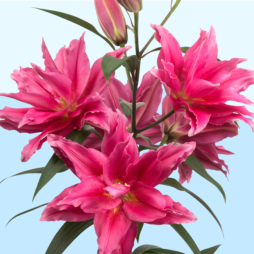 Очень крупные, ароматные, яркие и нарядные цветы с темно-розовыми лепестками, украшенными тонкой белой каймой, станут идеальным украшением цветника. Стебли довольно высокие, до 110 см, делают растение идеальным для посадки на заднем плане цветника. Цветы крупные, 18-20 см., махровые лепестки располагаются в три ряда, на одном цветоносе возможно до 7 цветков.. Цветение приходится на июль-август.
