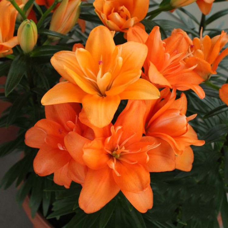 Миниатюрная азиатская лилия, прекрасно выращивается в горшках и открытом грунте. Высота растения до 50 см. Небольшие махровые цветки не производят пыльцу, не имеют сильного запаха, поэтому отлично подходят для аллергиков. Цветки имеют насыщенный розово-оранжевый цвет, стебли и листья темно-зеленые. Сорт рано цветет - в середине июня.
