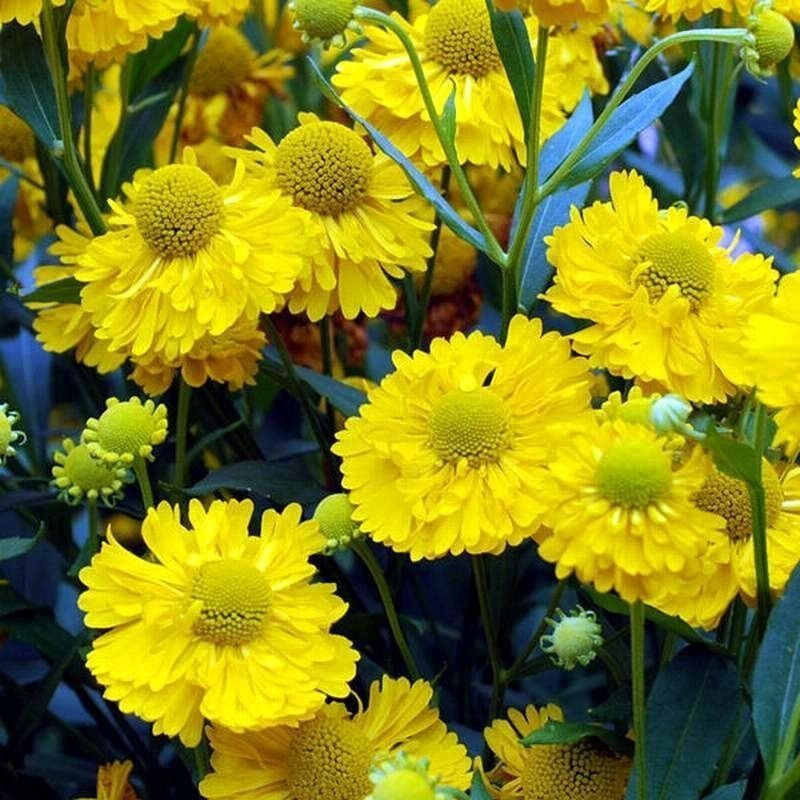 Обильно и продолжительно цветущий осенний корневищный многолетник. Высота до 70 см. Первый махровый сорт гелениума. Цветки махровые, канареечно- желтые с зеленоватой серединкой, расположены на прочных цветоносах. Цветет обильно и продолжительно с июня по сентябрь.