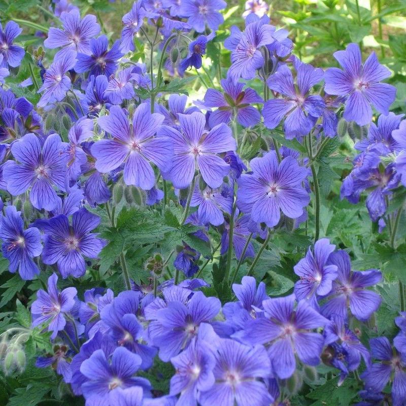Герань Блю Блад – эффектный почвопокровный неприхотливый многолетник. Высота 40 см. Цветки диаметром 4- 5 см сиренево- синие, с темными прожилками на лепестках. Листья сизовато- зеленые, округлой формы, с рассеченными лопастями. Период цветения середина июня- сентябрь.