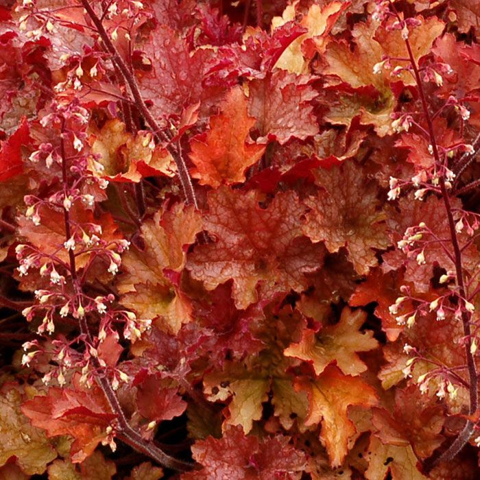 Сорт "осеннего настроения". Имеет резные, гофрированные листья с преобладанием оранжево-красных тонов. На протяжении всего периода роста происходит переход тонов: персиковый, коралловый. рыжий, медный. Высота около 25 см, диаметр 50-60 см., высота цветоносов до 50 см. Цветки маленькие, белые. Высота около 25 см, диаметр 50-60 см., высота цветоносов до 50 см. Цветёт июнь-июль. Зона зимостойкости: 4 (-35 ° С). Для посадки гейхеры наилучшим образом подойдут полутенистые места. Если участок освещается солнцем только в утренние часы - он оптимален для гейхеры. Почва должна быть рыхлой и хорошо дренированной, без застоя воды. Оптимальный рН=5-6.