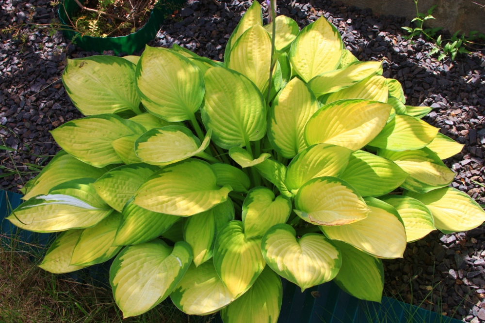 Весной листья светло-зеленого цвета с темно-зеленой каймой по краю. Затем центр листа становится золотистым, и хоста приобретает более яркую окраску. Яркость зависит от количества солнца. При полной освещенности золотистый превращается в почти белый. Цветки - светло-лавандовые.Куст высотой до 60-70 см. Ширина куста до 90-120 см. Период цветения июль-август.Зона зимостойкости: 3 (-40 ° С)