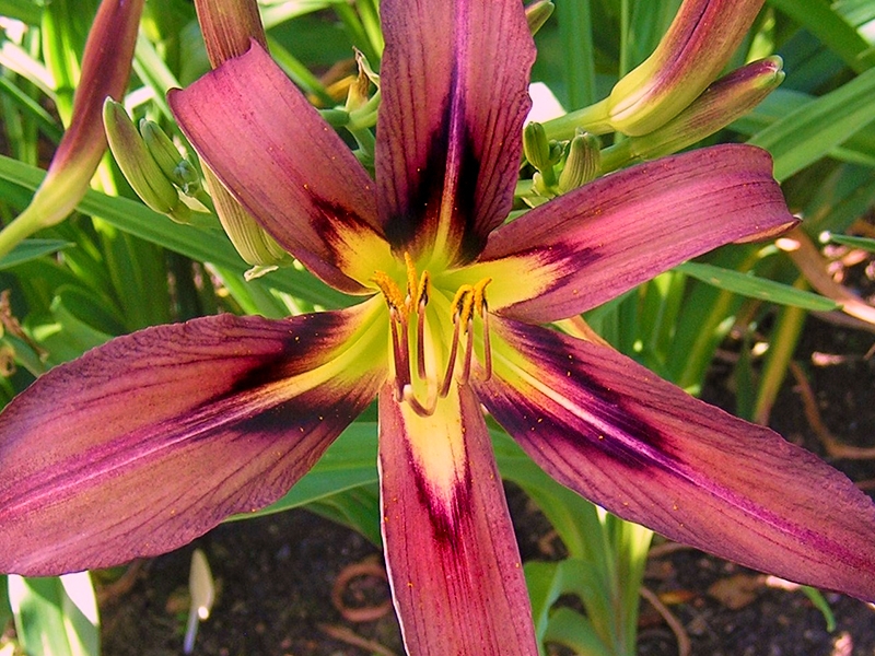 Этот лилейник имеет крупные, бордовые с легким кофейным оттенком цветы. Яркая, контрастная, цвета бургунди, звезда в центре, желто-зеленое горло и светлая полоса по центральной линии лепестков придают сорту характер и уникальный вид. Спайдер. Высота растения - 75 см, диаметр цветков 19 см.
