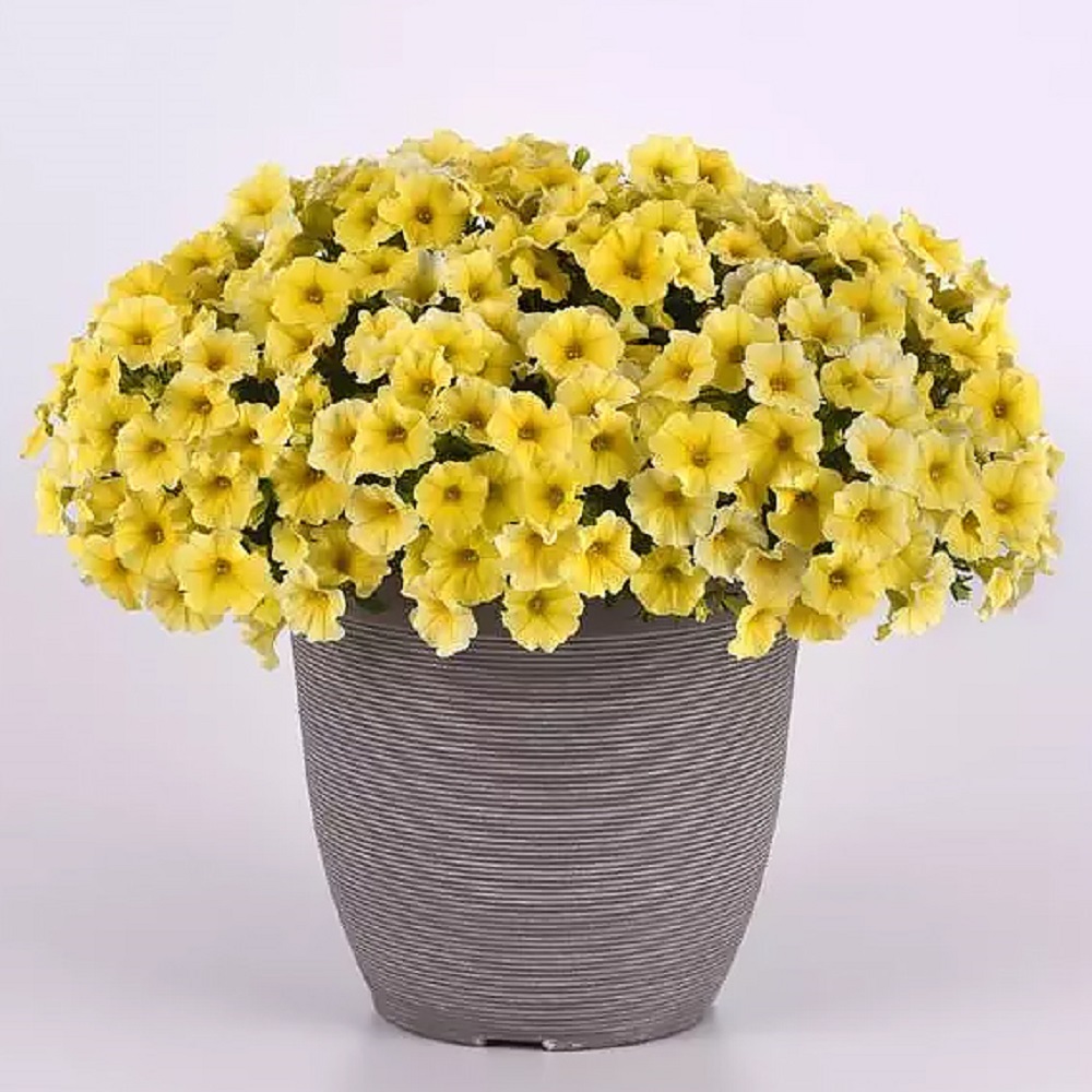 Это гибрид петунии и калибрахоа с ярко-желтыми цветами, который отличается обильным и длительным цветением, устойчивостью к непогоде и компактной шаровидной формой куста. Он подходит для выращивания в подвесных кашпо, вазонах и на клумбах. Семена высевают в феврале-марте, а при правильном уходе растение формирует пышный куст с цветами диаметром около 5-6 см.