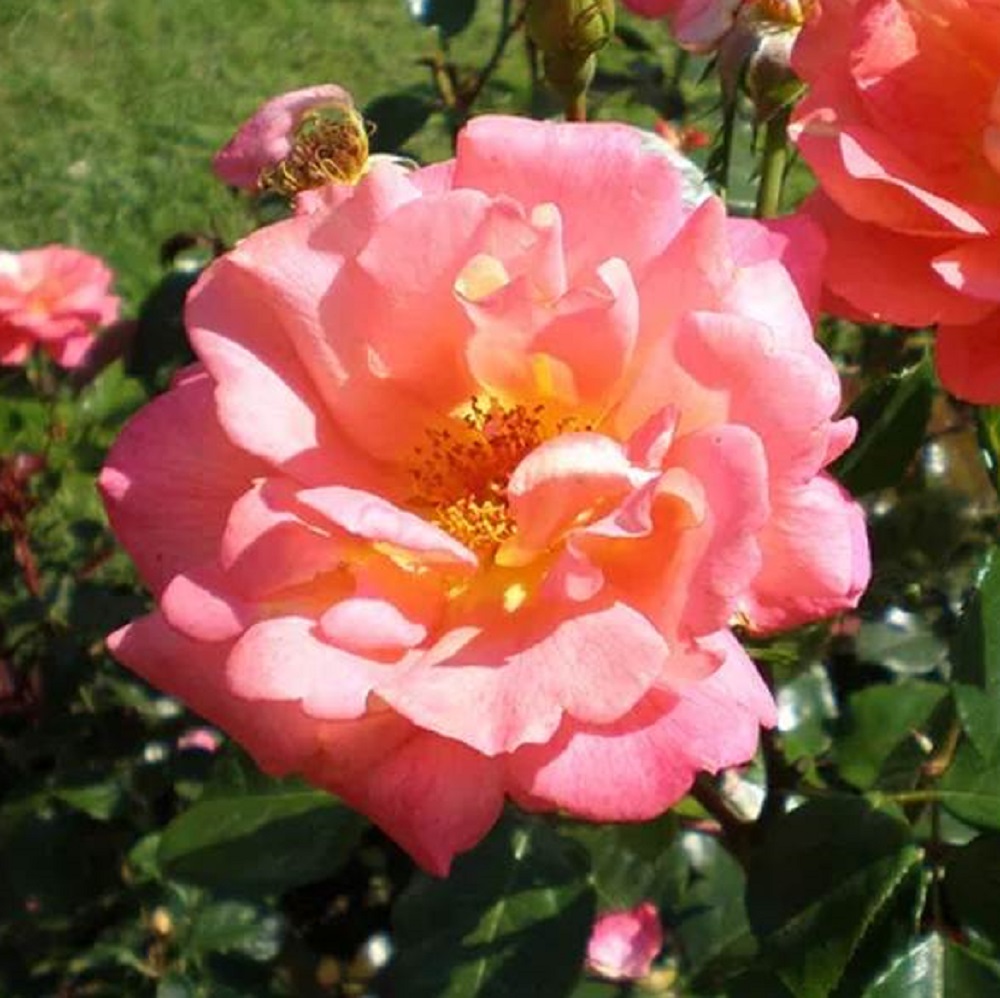Яркая, неприхотливая флорибунда с оранжево-желтыми, затем кораллово-красными, не выгорающими цветками, собранными в крупные зонтиковидные соцветия, цветет обильно все лето, обладает сильным здоровьем листвы и высокой устойчивостью к болезням и морозам, идеальна для клумб, бордюров, штамбов и срезки.